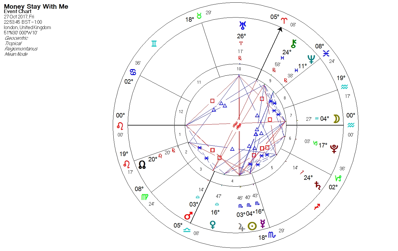 The fixed sign Leo rises and is also the cusp of the second house. The Sun is the Lord of the Ascendant and the second house, and is in the fixed sign Scorpio, as well as being angular in the 4th. The Moon is in Aquarius (a fixed sign) and is angular in the 7th. Not an ideal election since the Sun and Moon are not in any of their dignities, however, they are unimpeded by aspects from the malefics, and we have the North Node conjunct the second house of substance offering some additional aid to our wealth. The Sun is also still within a degree of conjunction with the greater benefic Jupiter, and the Moon is making an applying trine to Venus. As a bonus, the Part of Fortune is angular in the 10th house and in the fixed sign Taurus.