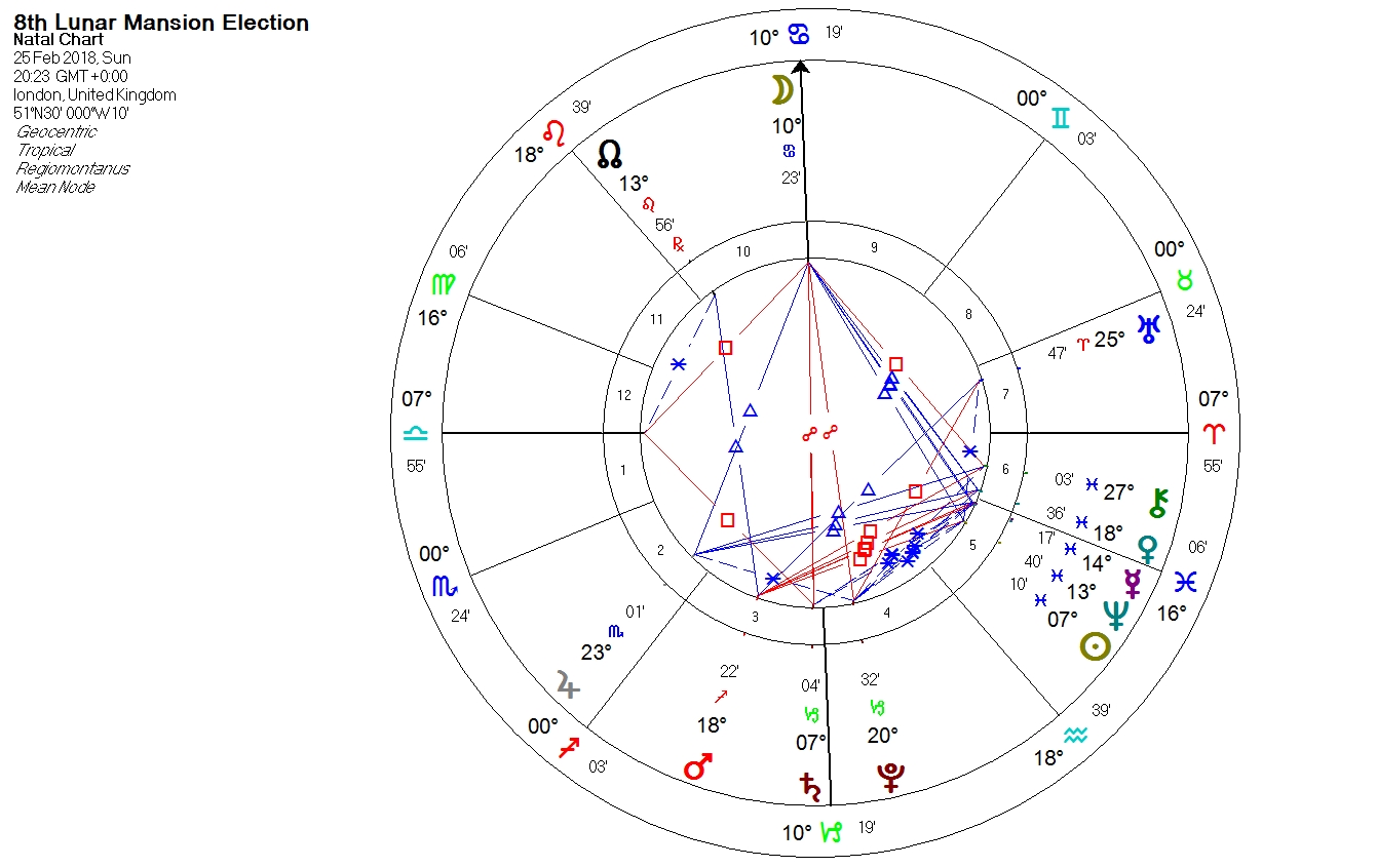 The Moon is waxing and it culminates in the 8th Lunar Mansion. The Moon makes applying trines to Mercury, and to both the benefics, Venus and Jupiter.