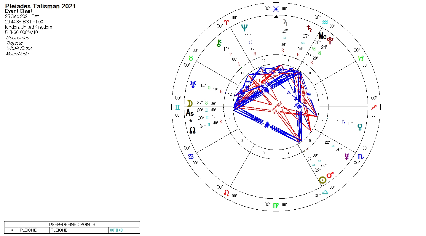 Pleione, one of the stars of the Pleiades, is rising. The Moon is few days after full. The Moon makes a very tight applying conjunction to Pleione (there are just over 3 degrees of separation) and an applying trine to the Sun, Mars and Saturn. The tight conjunction between the Moon and the star serves to make the effects of the talisman much more intense than usual.