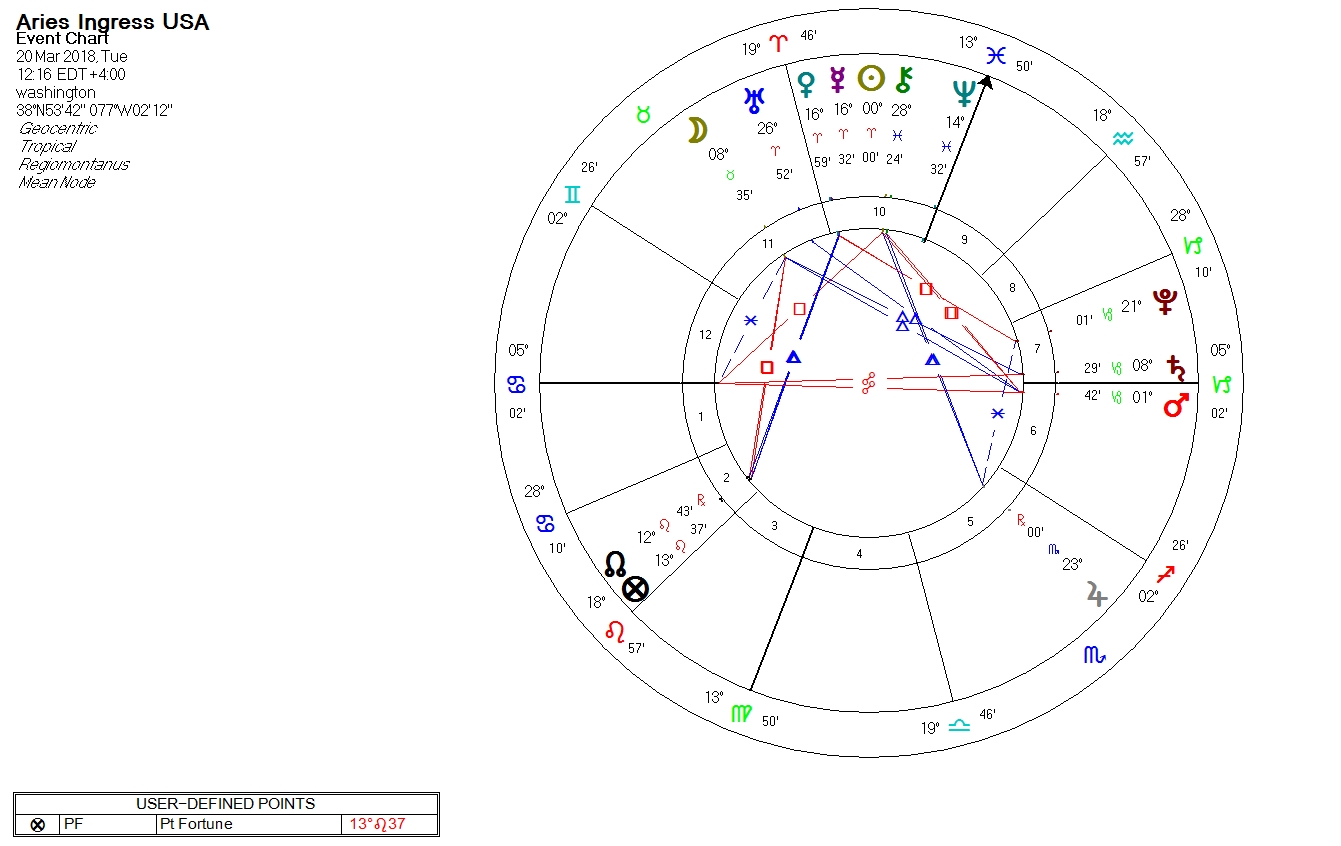 The Aries Ingress is one of the fundamental tools of mundane astrology, the branch of traditional astrology which aims to determine the influence of the planets on the earth in general, such as weather, disease, famine, war, and the affairs of a country in particular. A chart is drawn up for a particular location for the moment the Sun enters 0′ Aries and this chart is interpreted according to the rules of mundane astrology. Further charts are required if we have a cardinal or mutable sign rising.