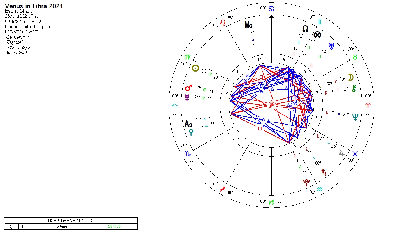 Venus is dignified by domicile in Libra and Venus is rising. Venus makes an applying trine to the greater benefic Jupiter. The Moon is a few days past full and makes applying an applying trine to the Sun and an applying sextile to Jupiter. It is Venus hour.