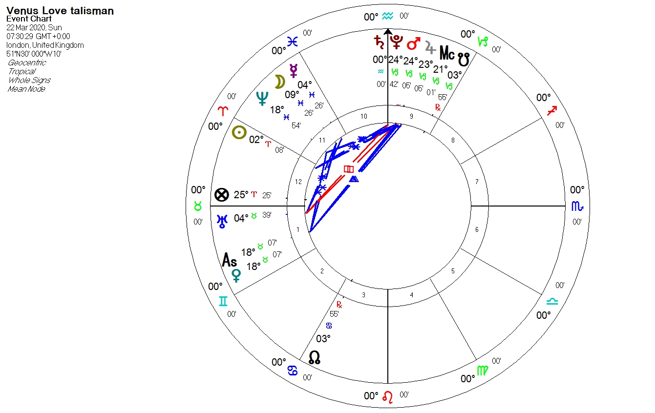 Venus is dignified by domicile and triplicity (+8 in William Lilly’s scoring) in Taurus and Venus is rising. Venus makes an applying trine to the greater benefic Jupiter. The Moon is waxing and makes applying sextile aspects to both Venus and Jupiter. It is Venus hour.